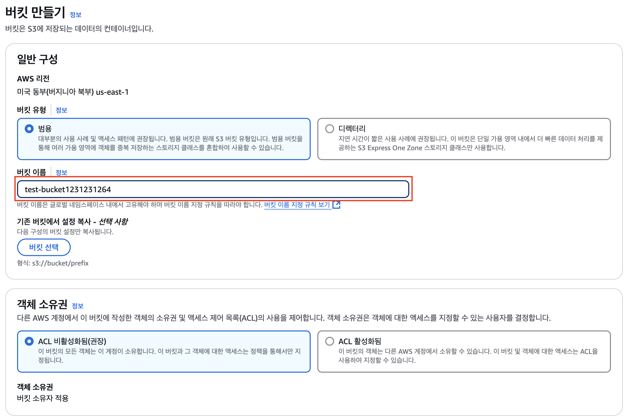 - 생성하고자 하는 버킷의 리전 선택