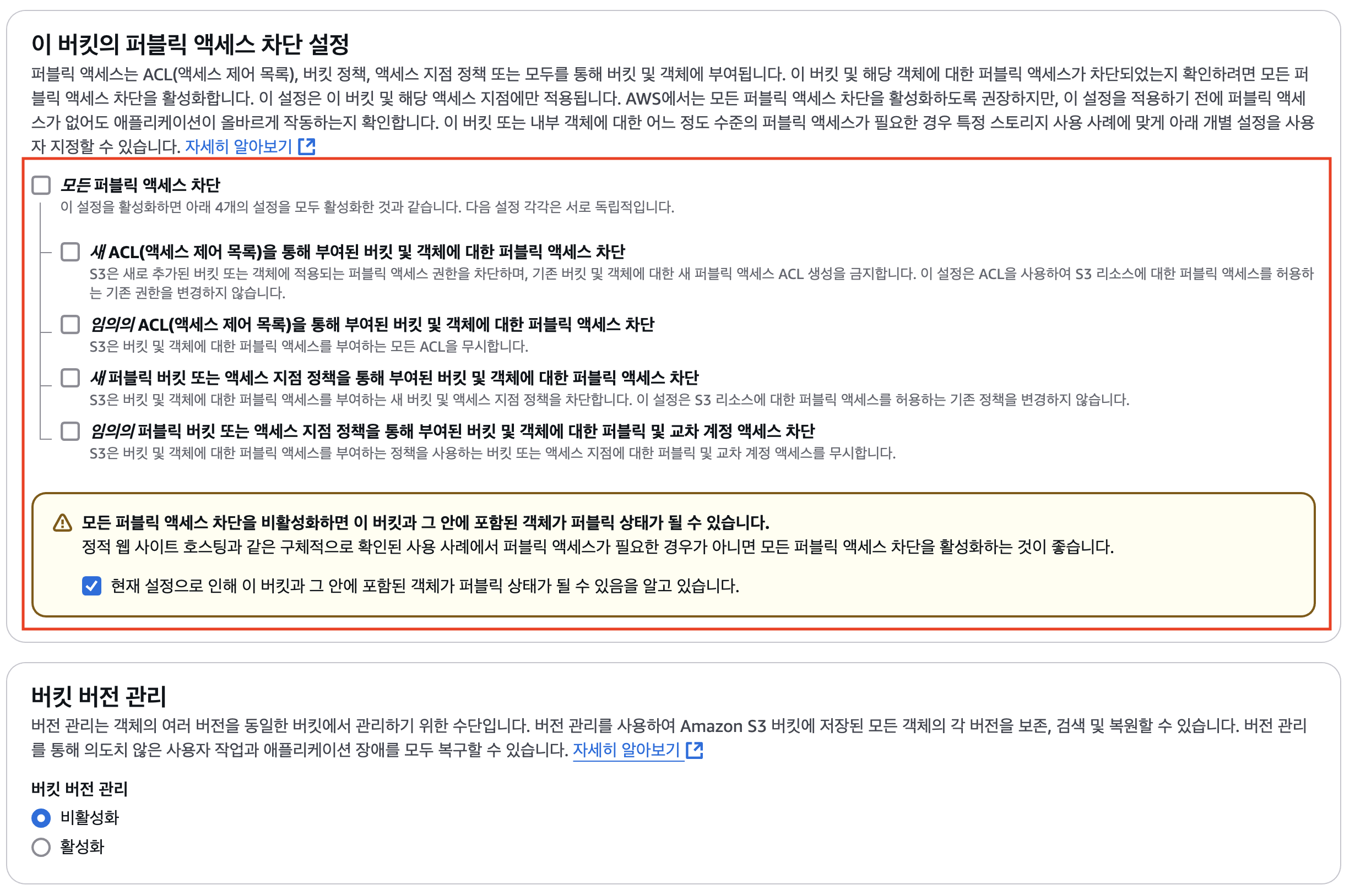 - 지금은 s3만을 이용해 웹 호스팅을 할 것이기에 차단 해제해 놓는다. 나중에 cloudfront를 연동하면 퍼블릭 엑세스를 차단할 것이다.