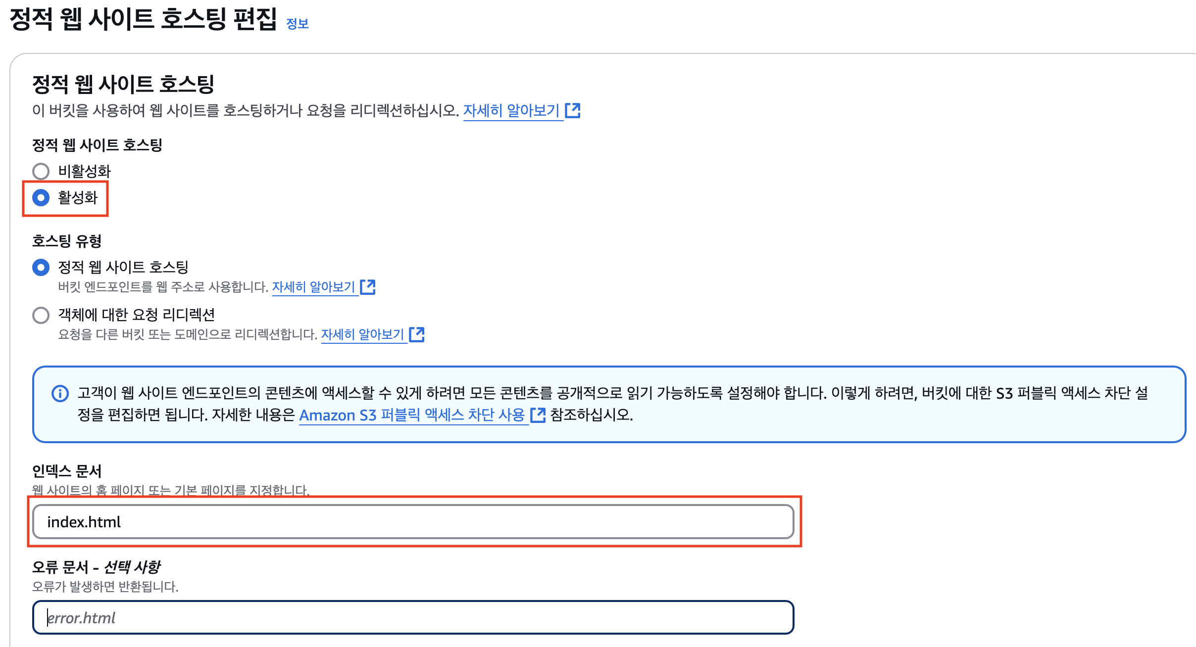 - 정적 웹 사이트 호스팅 활성화 체크