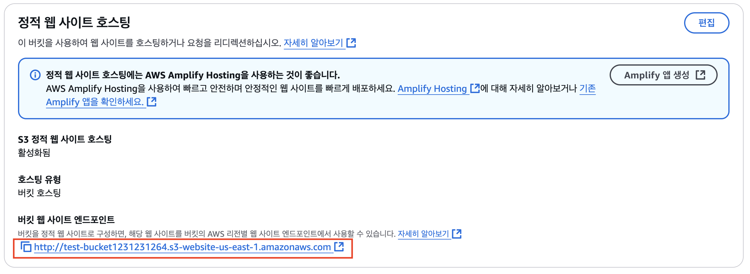 - 하단 정적 웹 사이트 호스팅의 엔드포인트 클릭