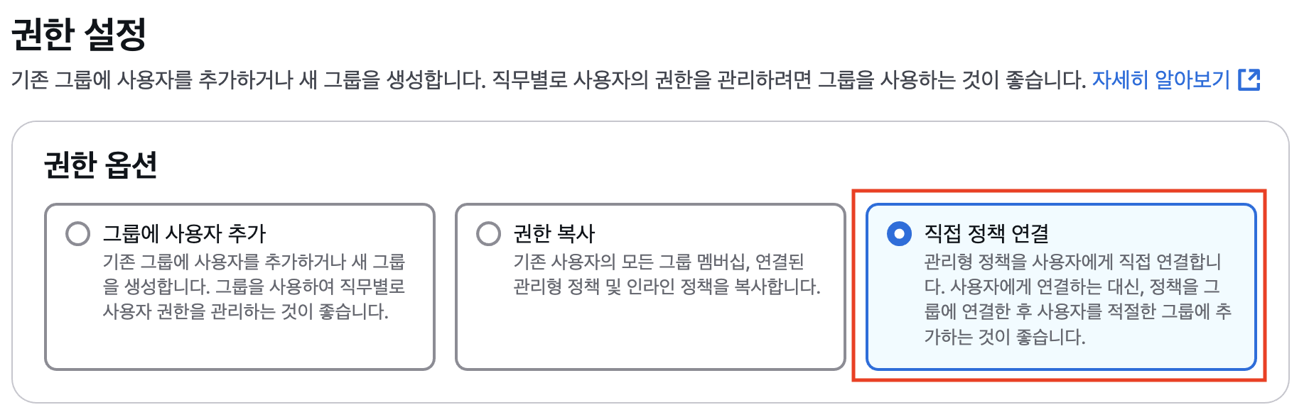 - 그룹을 만들지 않을 것이기에 직접 정책 연결