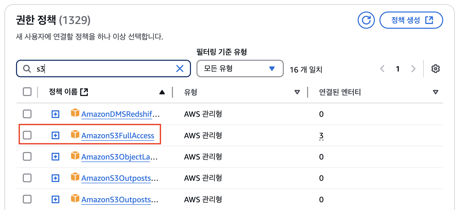 - s3 검색하여 AmazonS3FullAccess 정책을 선택한다.