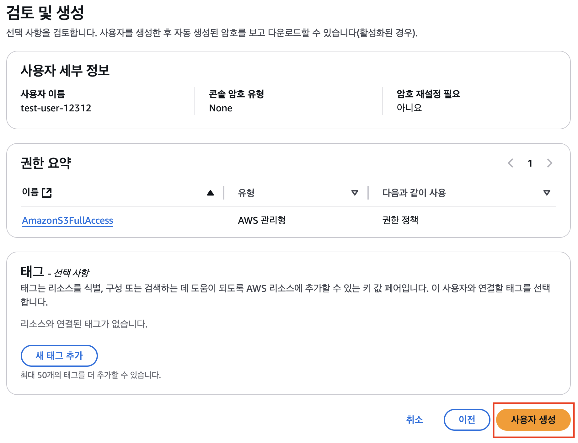 - 내용 확인 후 사용자 생성 클릭