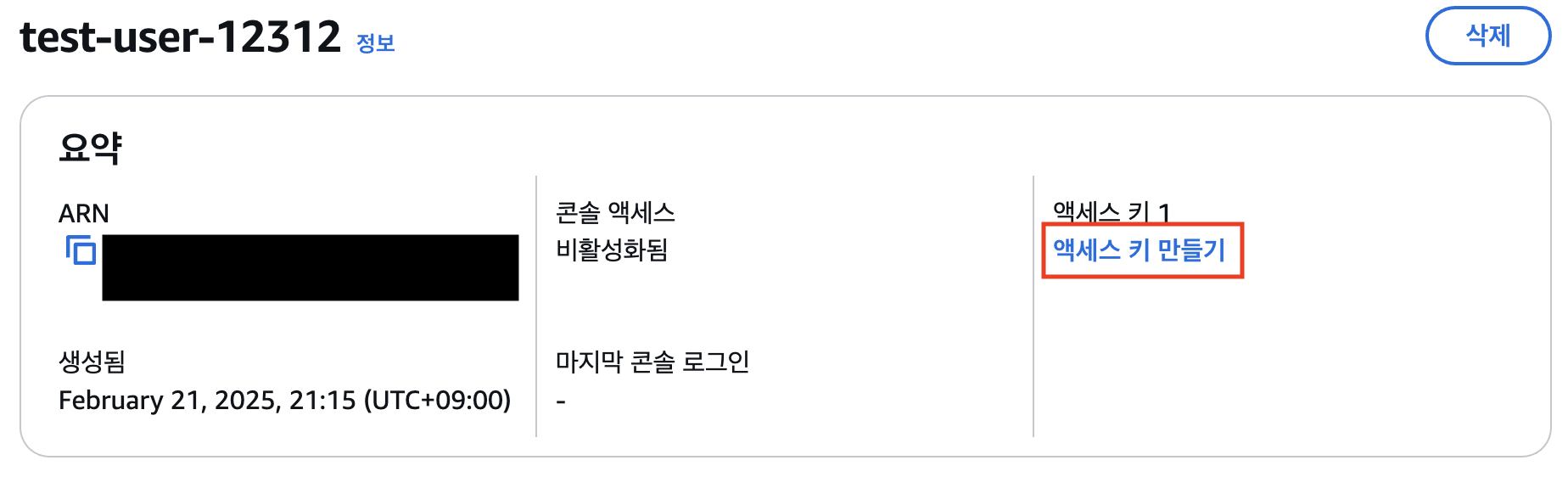 - 만든 사용자로 이동하여 엑세스 키 만들기 클릭