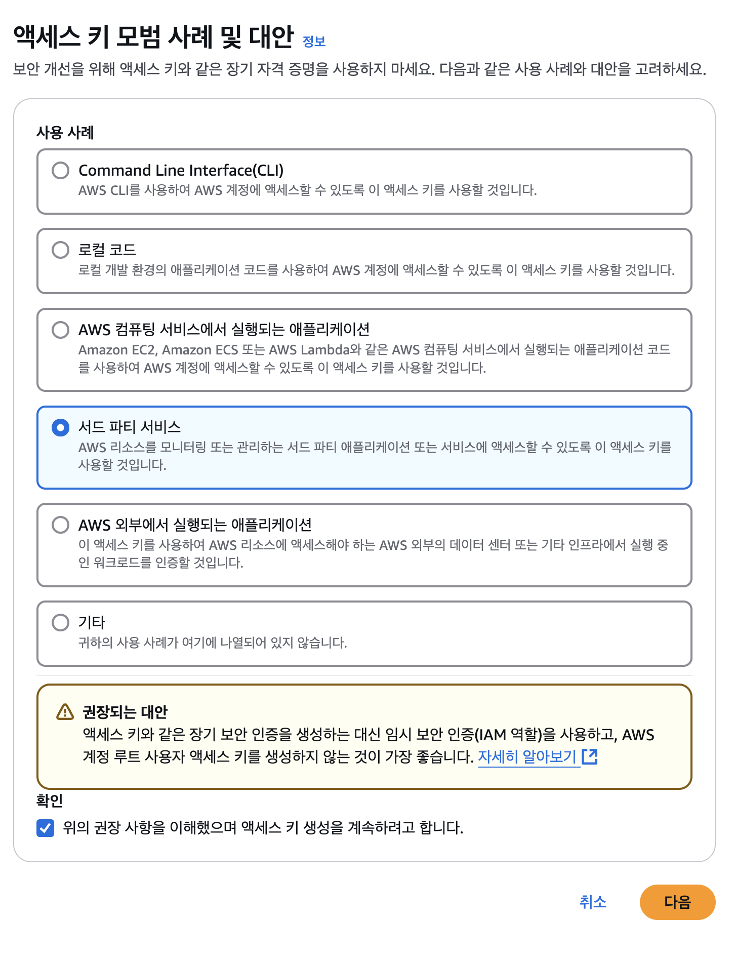 - 임시 보안 인증 IAM 역할을 사용하는게 좋다고 한다. 나는 장기간 사용할 예정이고 큰 문제가 될 것 같지 않아 무시하고 진행하였다.