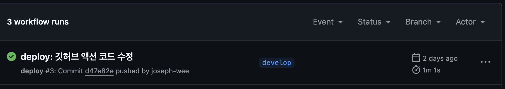 - 내용을 요약하자면 develop 브랜치에 push가 되면 이를 감지하여 아래 워크 플로우가 실행된다.