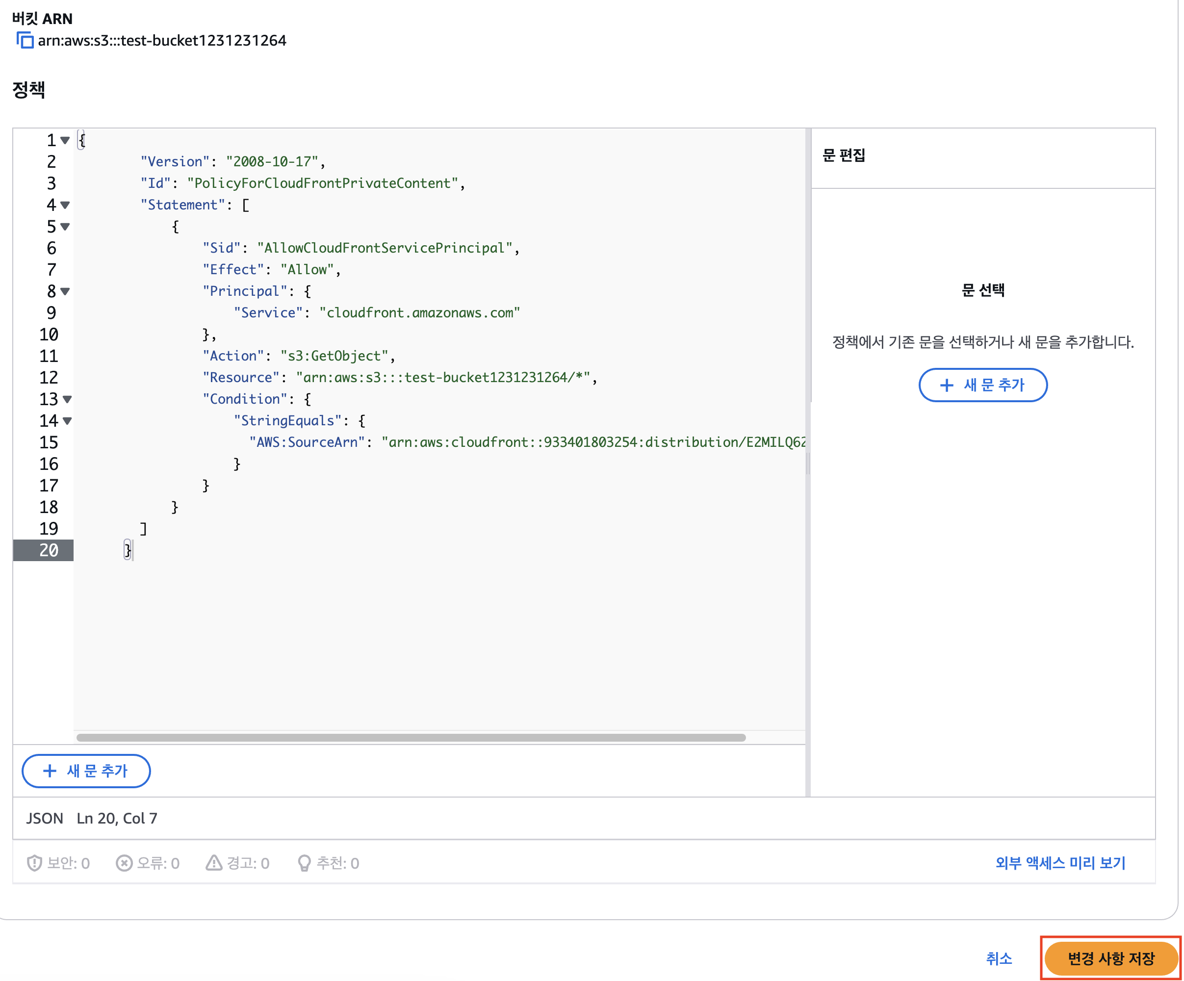 버킷에 CloudFront를 통해서만 접근할 수 있도록 버킷 정책을 업데이트 해야한다.