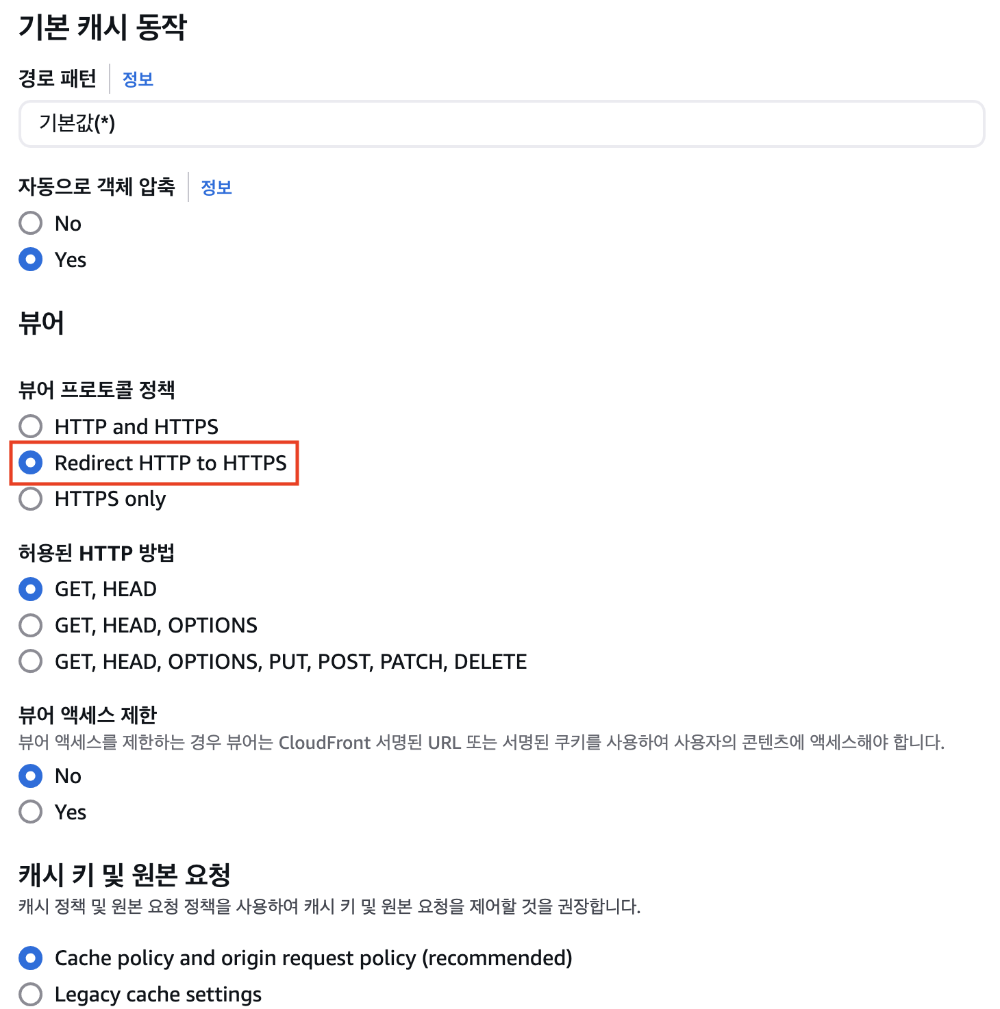 뷰어 프로토콜 정책 - Redirect HTTP to HTTPS 체크